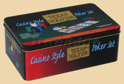 Фишки для игры в покер 200 шт, по 4 грамма Диаметр фишек 39 мм Номинал фишек 1$ -40 шт, 5$-40 шт, 10$-40шт, 25$-40шт, 50$-40шт Фишки выполнены из пластика Поле для игры Размер 60 на 90 см Две колоды карт с пластиковым покрытием, по 54 листа в колоде "Кнопка" дилера Алюминиевая коробка Размер 9 на 15 на 24 см Производство Швеция