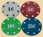 Фишки для игры в покер 100шт, по 4 грамма Диаметр фишек 39 мм Номинал фишек 1$ - 25шт, 5$ - 25шт, 10$ - 25шт, 25$ - 25шт. Две колоды карт с пластиковым покрытием, по 54 листа в колоде Производство Китай