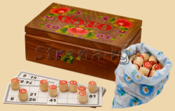 Размер ларца 10 на 16 на 26 см Материал ларца - липа. Крышка ларца снимается просто вверх, у неё нет петель. Сверху на неё вручную нанесён цветной красочный рисунок в виде цветов и надписью "Лото" Высота бочонка 23 мм, диаметр 21,5 мм, количество бочонков - 90 штук Материал из которого изготовлены бочонки для лото - берёза В комплекте есть картонные фишки для закрытия повторных номеров, которые выпадают на карточках, в количестве 44 штуки Производитель Россия