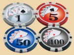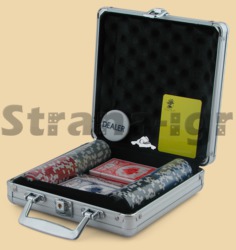 Фишки для игры в покер 100 шт, по 11,5 грамм Диаметр фишек 39 мм Номинал фишек 1$ -25 шт, 5$-25 шт, 10$-25 шт, 50$-25 шт. Две колоды карт "TEXAS HOLDEM" с пластиковым покрытием, по 54 листа в колоде, покерный размер, увеличенный индекс, подрезная карта "Кнопка" дилера Кубики 5 шт Алюминиевый дипломат Размер 6,5 на 21 на 23 см Производство Китай