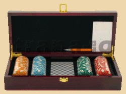 Фишки для игры в покер 100 шт, по 7,5 грамм Диаметр фишек 39 мм Фишки без номинала Фишки выполнены из пластика Одна колода карт с пластиковым покрытием, по 54 листа в колоде Блокнот и карандаш Деревянная коробка Размер 6 на 13 на 30,5 см Производство Китай