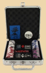 Фишки для игры в покер 100 шт, по 14 грамм Диаметр фишек 39 мм Номинал фишек 1$ -25 шт, 5$-25 шт, 50$-25шт, 100$-25шт Фишки выполнены из пластика с металлическим сердечником внутри, на обоих сторонах нанесены высококачественные голографические наклейки с номиналом фишек Две колоды карт "TEXAS HOLDEM" 100% пластик, по 54 листа в колоде, покерный размер, увеличенный индекс "Кнопка" дилера Кубики 5 шт Алюминиевый дипломат Размер 6,5 на 20,5 на 21 см Производство Китай