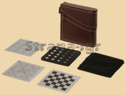 Размер 10 на 10 см, толщина 3 см В набор включены следующие игры: шашки, квадрия, крестики-нолики, шестерка Материал металл, упаковка из кожзама Производитель Китай