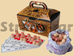 Размер ларца 16 на 25 на 25 см Материал коробки картон Высота бочонка 25 мм, диаметр 21,5 мм, количество бочонков - 90 штук Размер карточки 8,5 на 22 см Материал из которого изготовлены бочонки для лото - берёза В комплекте есть пластиковые фишки диаметром 2 см для закрытия повторных номеров, которые выпадают на карточках, в количестве 135-ти штук!!! Производитель Россия