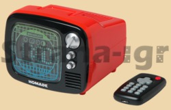 Часы имеют оригинальную форму старого доброго телевизора с пультом дистанционного управления. На экране телевизора вы можете видеть время, а также с часами можете насладиться мелодиями из еле-передач. С помощью пульта ДУ вы можете отключить экран, чтобы сделать полную темноту и насладиться сном. Корпус часов сделан из пластика желтого и черного цветов. Для удобства у будильника есть ручка для переноски. Будильник оснащен ЖК-дисплеем и кнопками для установки времени.