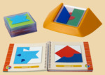 В комплекте: буклет со 100 заданиями; - 18 прозрачных плиток с цветными фигурами, - подставка.