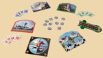 В комплект игры входят 4 карты с пунктом назначения, 4 игровых фишки с самолетом, взлетная полоса с двумя креплениями, колесо фортуны пилота со стрелкой, 10 фишек с изображениями шторма, 12 марок из различных стран и правила игры на русском языке.