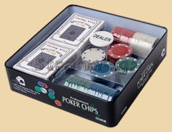 Фишки для игры в покер 100шт, по 4 грамма Диаметр фишек 39 мм Фишки без номинала Две колоды карт с пластиковым покрытием, по 54 листа в колоде Алюминиевая коробка Размер коробки 20 на 20 на 5 см Производитель Китай