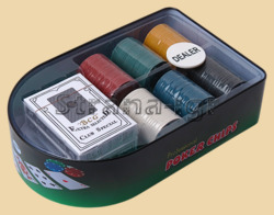 Покерный набор из 120 фишек без номинала в алюминиевой коробке Размер упаковки 15 на 24 см Диаметр фишек 39 мм Две колоды карт с пластиковым покрытием, по 54 листа в колоде, кнопка дилера Производство Китай