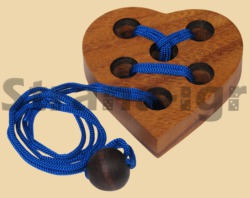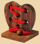 Задание - вытащить шнурок из сердца Уровень сложности 2 из 5 Размер головоломки - 9 на 9 см Материал: тропическое дерево, верёвка Производитель Индонезия