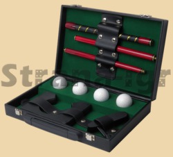 Размер кейса 22 на 33 см, высота 6,5 см Материал кейса - дерево, покрытое кожей В комплекте: луза, клюшка, 4 мяча Производитель Китай