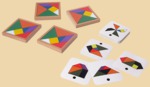 В комплект входит: Четыре набора из квадрата, параллелограмма и пяти треугольников каждый; Деревянные коробочки по числу наборов; Карточки с задачками, подсказками и ответами разной степени сложности
