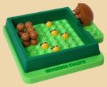 Как эти ёжики смогут убежать? Конечно, через изгородь! Десять неожиданно столкнувшихся с вредными барсуками маленьких ёжиков вынуждены катиться вместе, чтобы добраться до низкого участка изгороди, где их ждет мама-ежиха. У вас есть поле, представляющее собой лунки, несколько фишек-барсуков и единый элемент, составленный из 10 круглых маленьких ежиков. Расставьте фишки барсуков и ёжиков на поле так, как указано в задании. Вам нужно провести фигуру из ёжиков к низкой части поля-изгороди, не задев при этом барсуков.