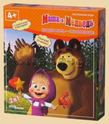В комплекте: двустороннее игровое поле (1 шт.) карточки с Машей и Медведем (12 шт.) жетоны-карамельки (6 шт.) фишки (4 шт.) декорацию «Маша» (1 шт.) планшет с количеством ходов (в центр планшета крепится стрелка) (1 шт.) правила игры (1 шт.)