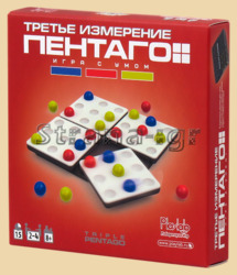 Пентаго "Третье измерение" - это новая версия Пентаго, в которой добавился третий цвет и новый элемент, стратегически важный для победы в игре. Цель игры - построить рисунок-линию из 5 шаров, изпользуя шарики 3 цветов. В игре есть колода карт-заданий, на каждой из которых изображена 3-цветная комбинация шаров. В игре также можно вращать одну из четвертей игрового поля и поворачивать ее в любую сторону на 90 градусов по или против чаосвой стрелки. Игра динамичная и веселая. Она дарит удовольствие как новичкам, так и опытным игрокам!