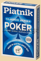 Колода состоит из 55 карт Размер карт - длина 88,9 мм, ширина 63,5 мм ("покер" размер) Индекс карт стандартный Классические лица Синяя рубашка Карты с пластиковым покрытием Производитель Австрия (Piatnik)