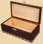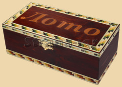 Размер ларца 13 на 26 см, высота 8 см Материал корпуса ларца - сосна, сверху ларца нанесён рисунок в виде надписи "ЛОТО", в технике маркетри. Снаружи ларец покрыт глянцевым лаком. Плюс к этому шкатулка покрыта тёмной морилкой, что придаёт ей очень элегантный внешний вид. Производитель Россия