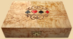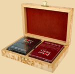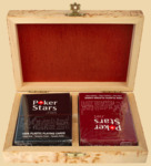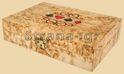 Размер шкатулки для карт 16 на 11,5 см, высота 4,5 см Материал шкатулки для домино - карельская берёза Береза карельская - это разновидность Березы повислой. Карельская береза является аномалией, названной синдромом ямчатости стебля, и поэтому в природе встречается относительно редко. Её естественный ареал простирается от западной части Норвегии и Швеции на юго-восток Карелии, на южную часть стран Балтии, Польши и Беларуси. Древесина очень декоративна, напоминает деревянный мрамор. Имеет множество волнистых переливов светло-желтых оттенков с темными полосками. Невероятно твердая, вязкой структуры. Игральные карты 100% пластик (COPAG) Размер карт стандарта «покер»: 88х63 мм 54 листа (52 + 2 джокера) в каждой колоде Рубашка чёрная на одной колоде и бордовая на другой Подарочный набор 2-х колодный Poker Stars из карельской берёзы - это эксклюзивный и дорогой подарок важному для вас человеку. Такой подарок не оставит его равнодушным! Очень красивая текстура дерева и оригинальный внешний вид подчёркивают важность и эстетичность данного подарка. Вес домино 520 гр. Производитель Россия (Карелия)